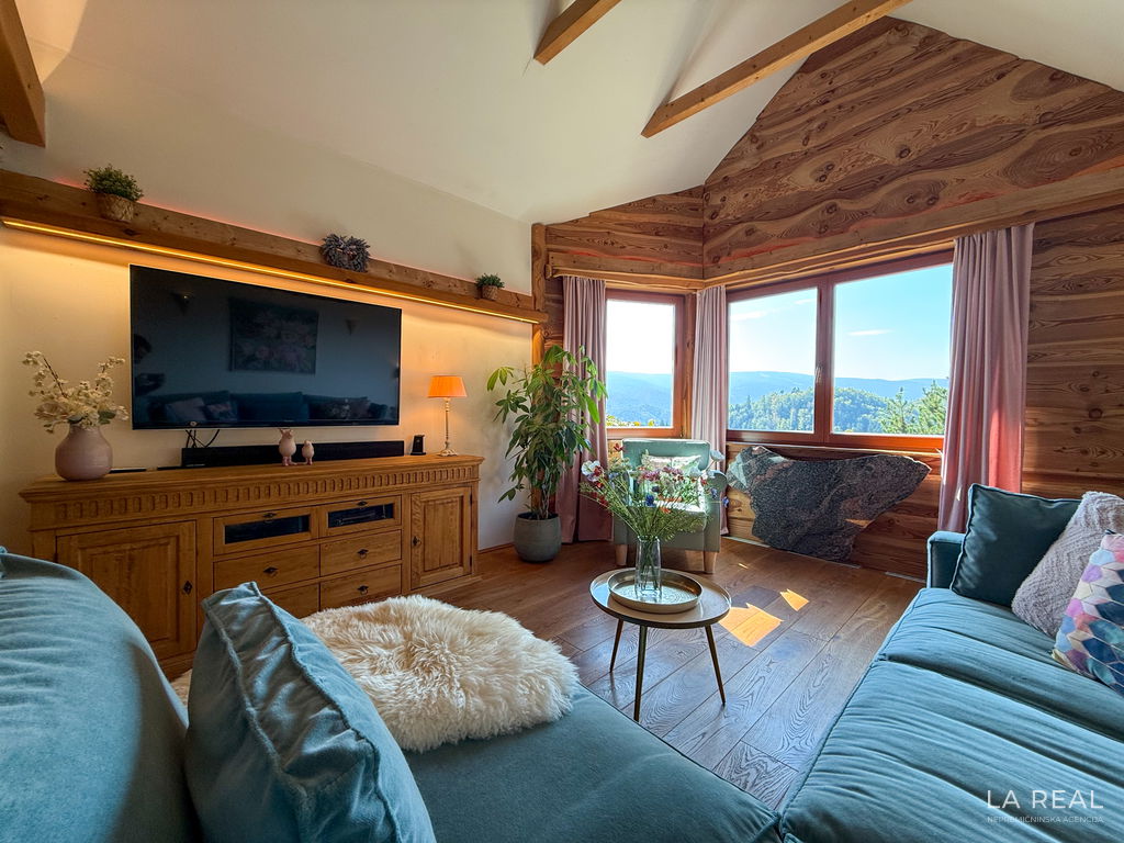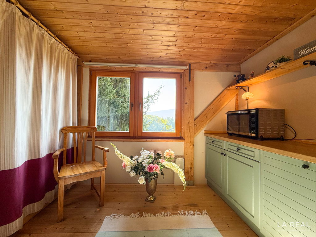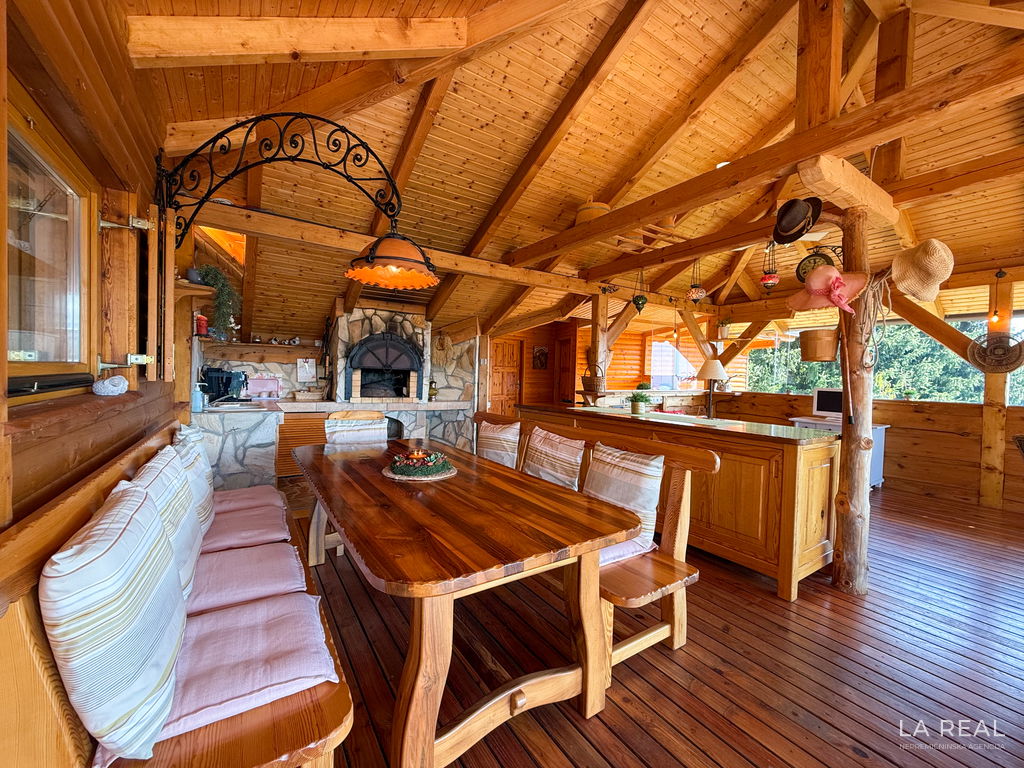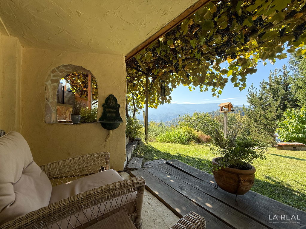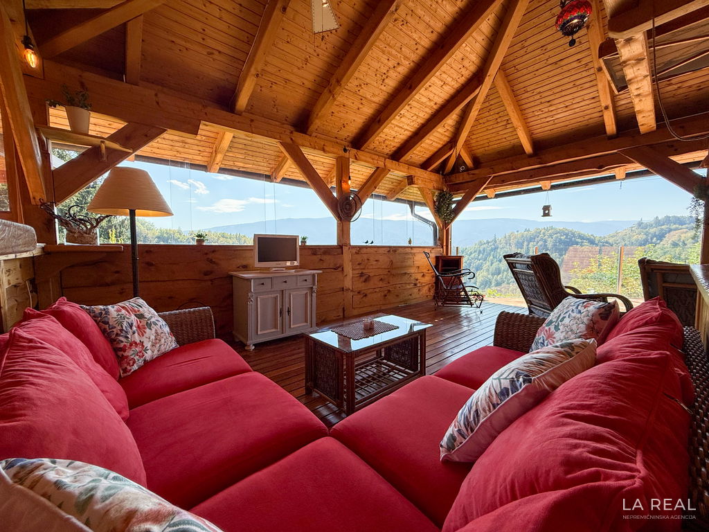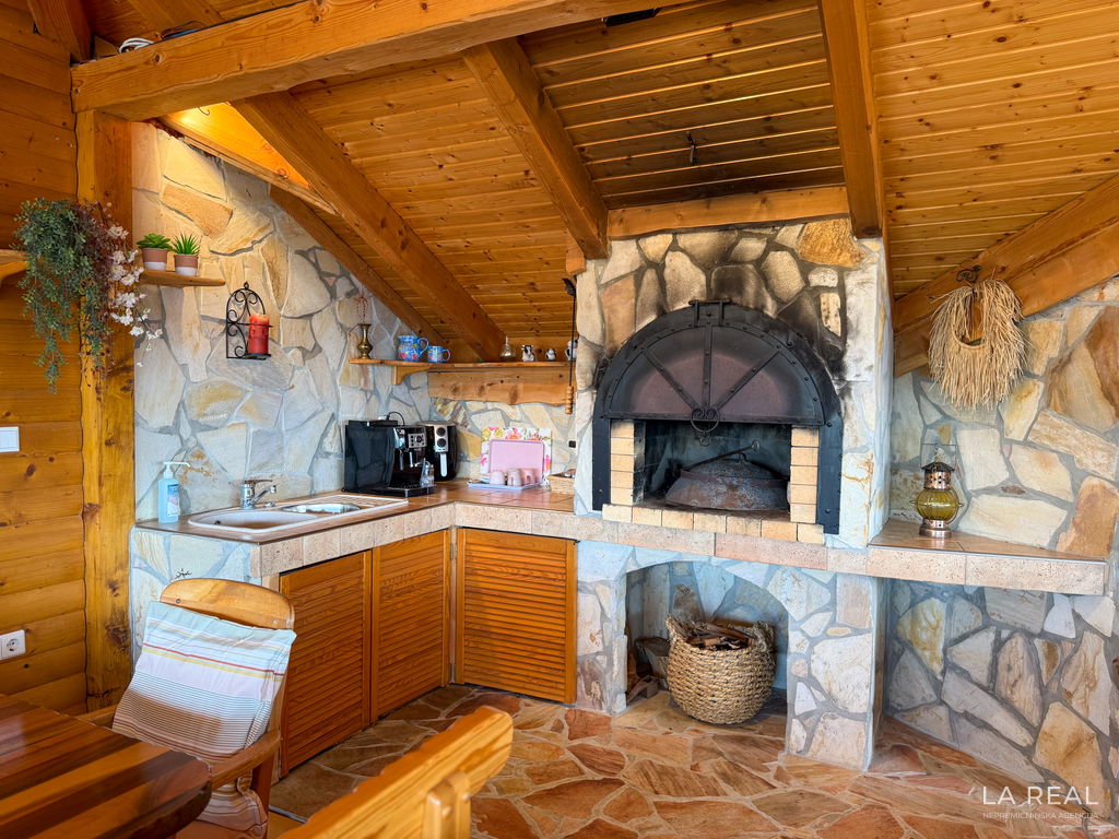 The house is decorated with a large terrace. It offers a pleasant stay with a beautiful view. The terrace also contains a summer kitchen with a fireplace, a large walnut table with benches and a seating area, divided by a walnut chest of drawers just under 5 meters long. The floor is larch.