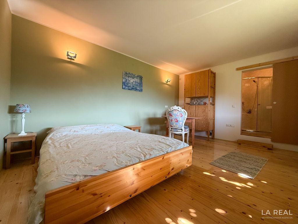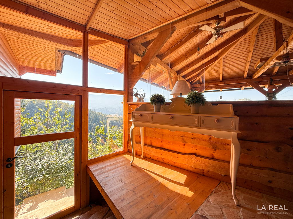 Sredma, Bresternica: We are selling an idyllic house built with high-quality natural materials with a wonderful view on top of the hill above Bresternica. The house is very spacious, has a basement and has a separate wellness area (sauna, fireplace, relaxation area) and a studio apartment for guests. The beautiful and spacious terrace with summer kitchen is equipped with a heated massage pool – jacuzzi, summer kitchen with brick fireplace and movable glazing.