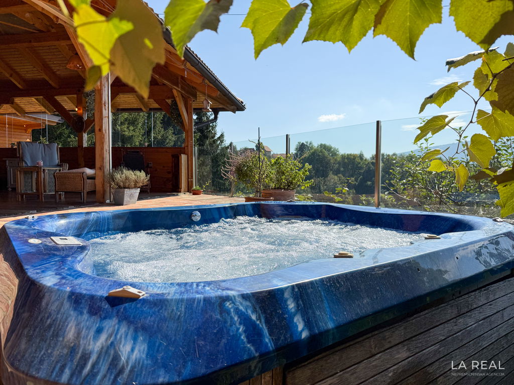 Ob hiši je velika terasa (80m2) z masažnim bazenom in kombinirano leseno/stekleno ograjo, ki nudi prekrasen pogled. Terasa je večinoma pokrita (60 m2) in se zapira z električnimi žaluzijami.