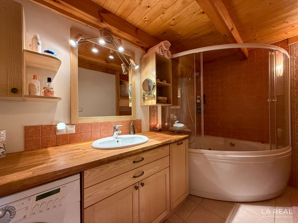 Behind a small passage with a wooden corner wardrobe are the bathroom and the bedroom. The bathroom is L-shaped, has a corner massage bath and a sink on a wooden counter.
