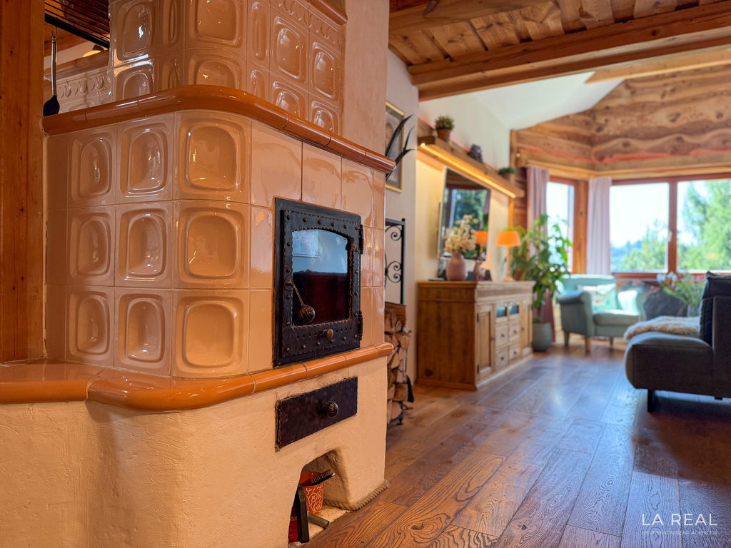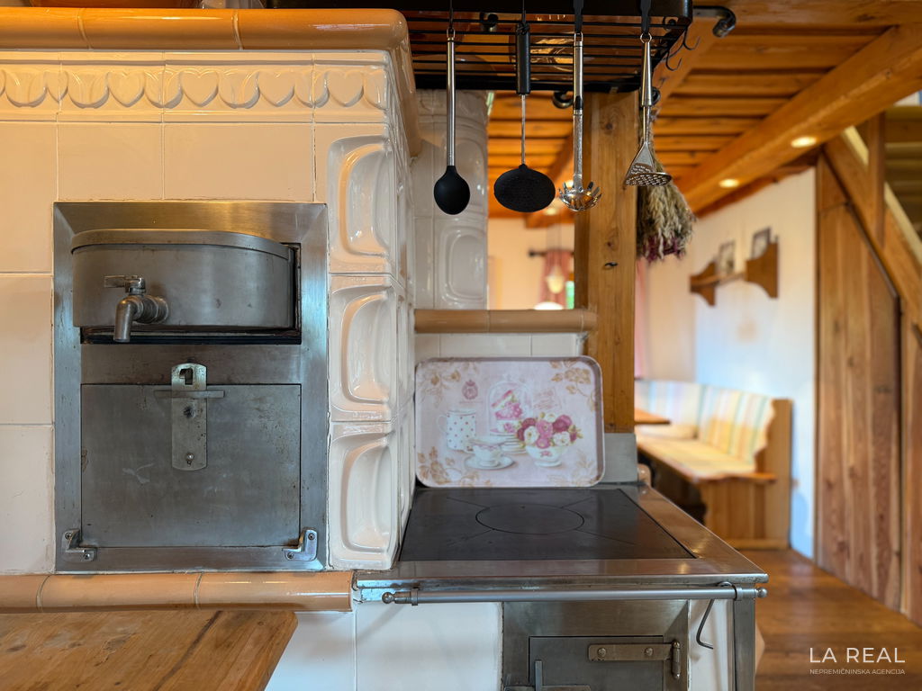Dnevno bivalni prostor centralno zavzema velika domača krušna peč. Peč ima dve kurišči, v dnevnem prostoru so kaminska vrata, v delu, ki sega v kuhinjo pa štedilnik, pečica in grelec vode na trdo kurivo. S pečjo se ogreva celotna hiša in pozimi tudi kuha. Tla v dnevnem prostoru so izdelana iz colskih, krtačenih hrastovih desk. Stena pri velikem oknu, obrnjenem na JZ, je obložena s posebno izbranimi kosi lesa ter električnim radiatorjem iz naravnega kamna. Dnevni bivalni prostor in tudi terasa sta opremljena s kreativno razsvetljavo, ki v večernih urah pričara prav posebno vzdušje.