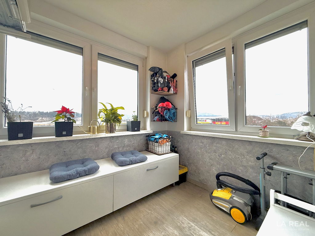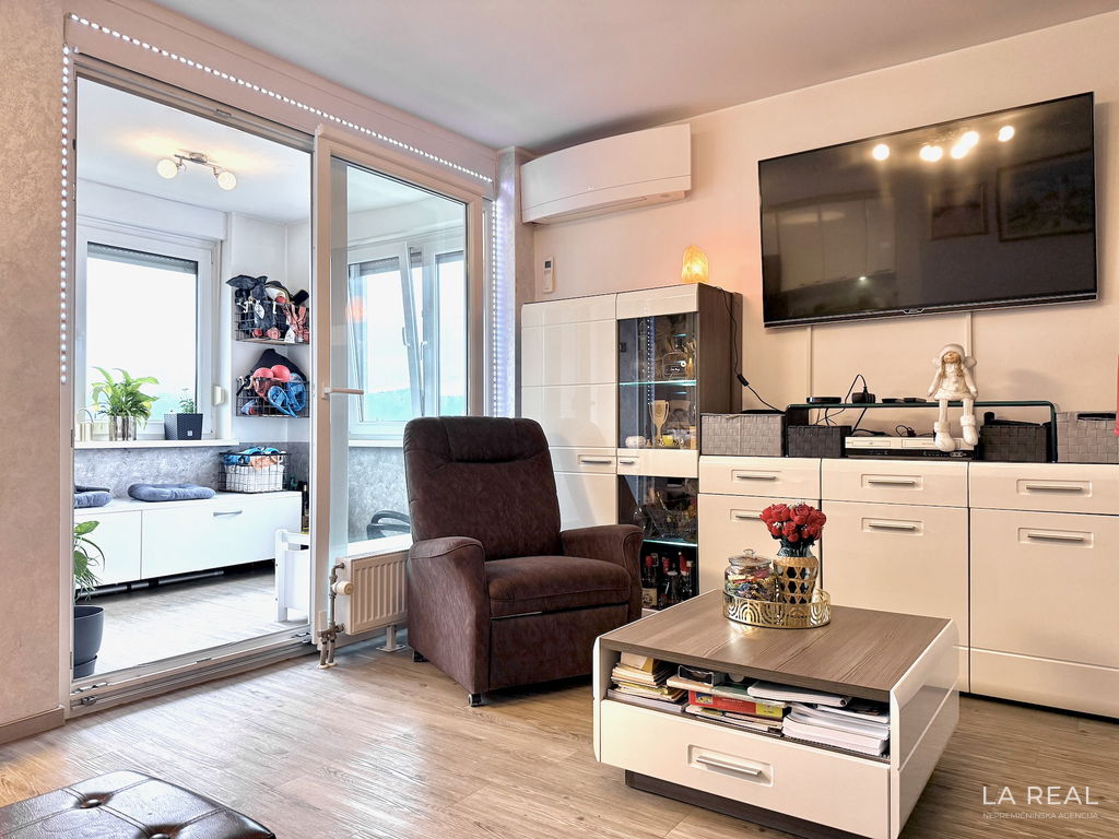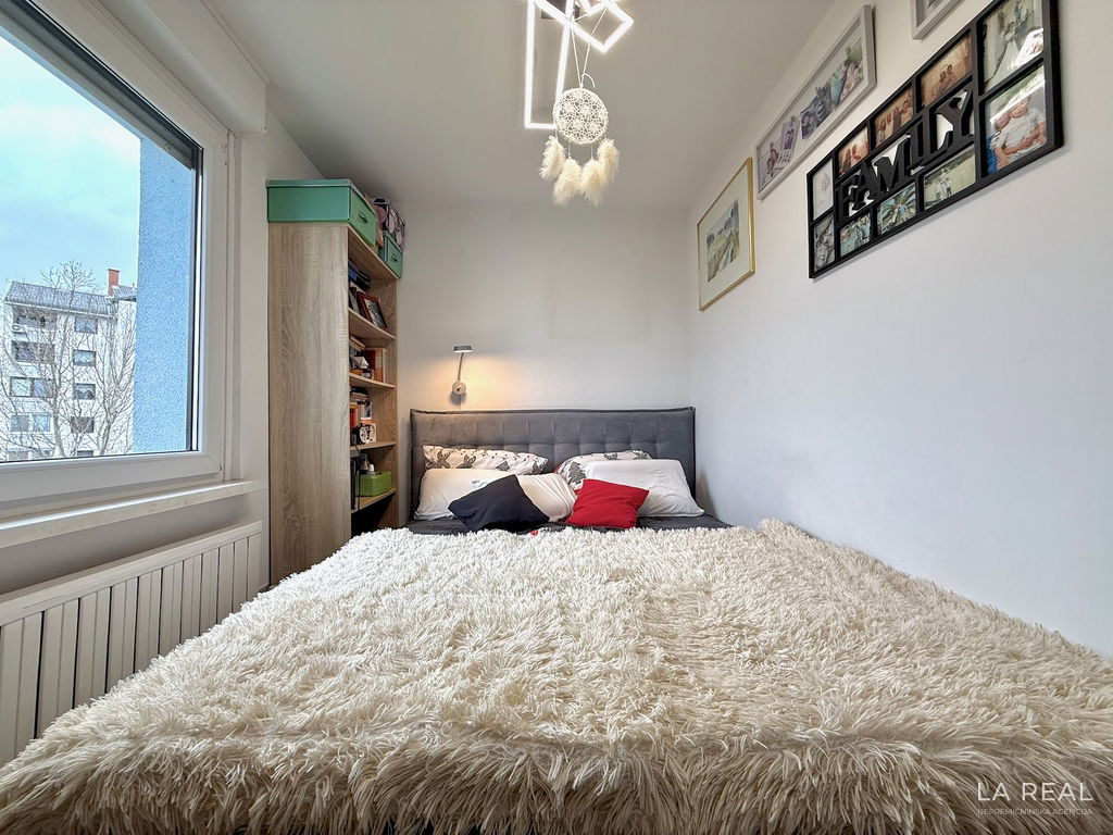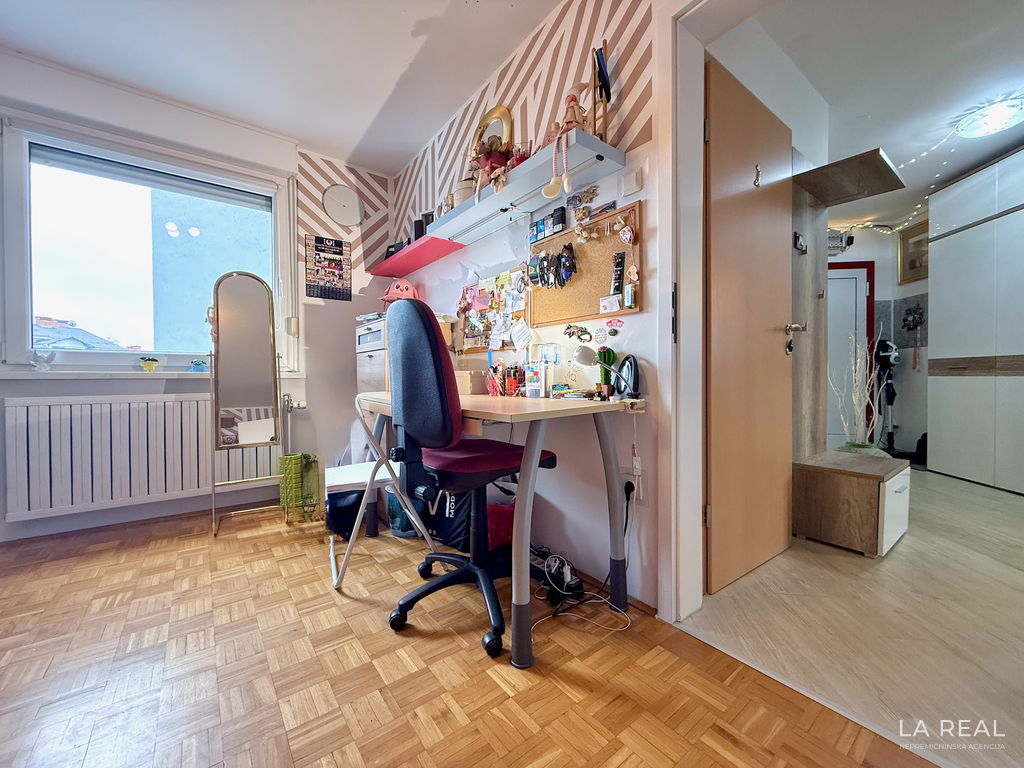 - Razporeditev: predsoba, dnevnobivalni prostor z izhodom na zastekljen balkon, spalnica, otroška soba, kopalnica, ločena toaleta, kletna shramba