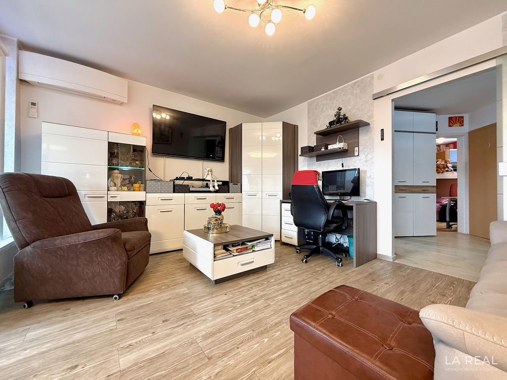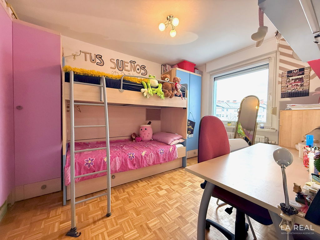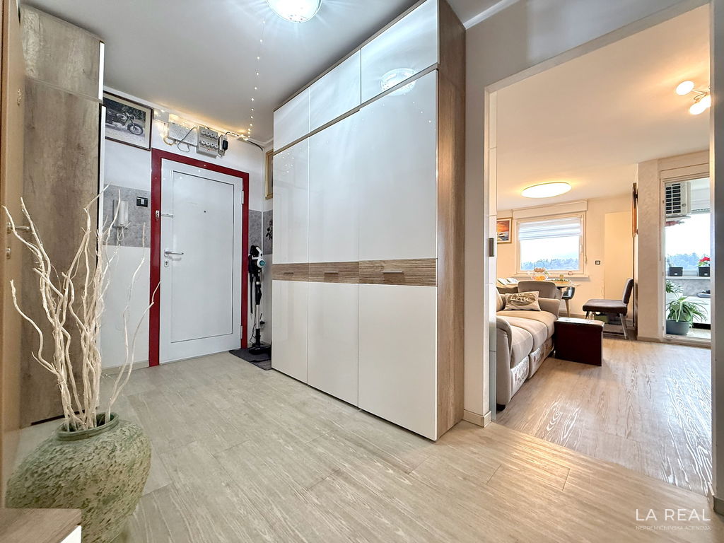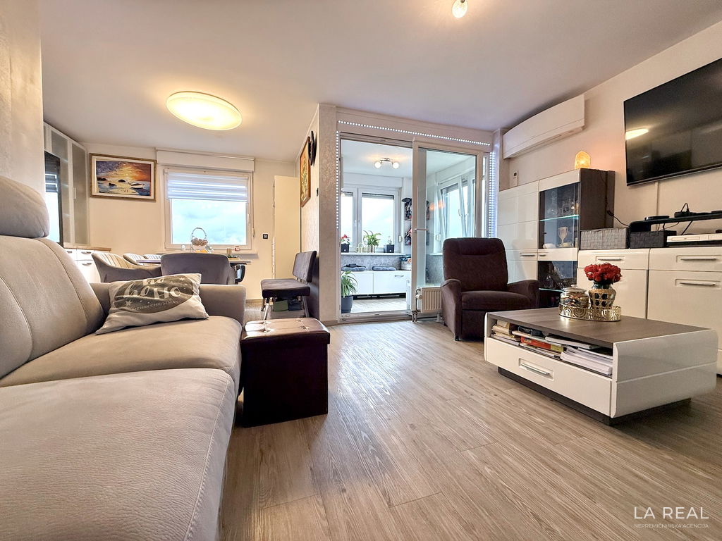 - Razporeditev: predsoba, dnevnobivalni prostor z izhodom na zastekljen balkon, spalnica, otroška soba, kopalnica, ločena toaleta, kletna shramba