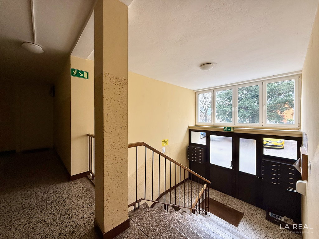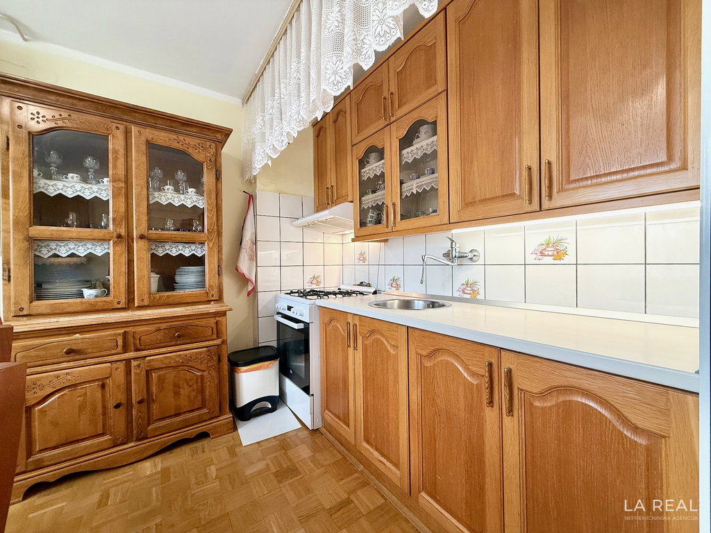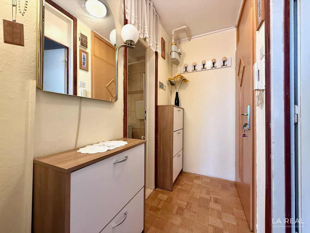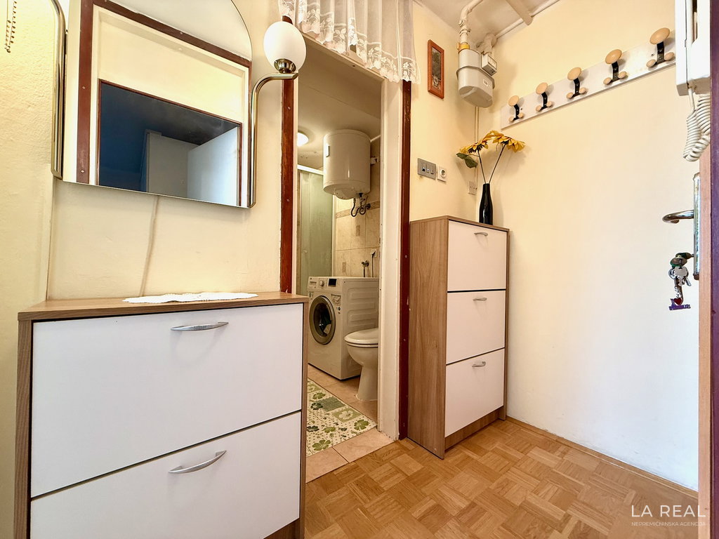 - Razporeditev: predsoba, dnevnobivalni prostor z izhodom na zastekljen balkon, spalnica, kopalnica, kuhinja z jedilnico, kletna shramba